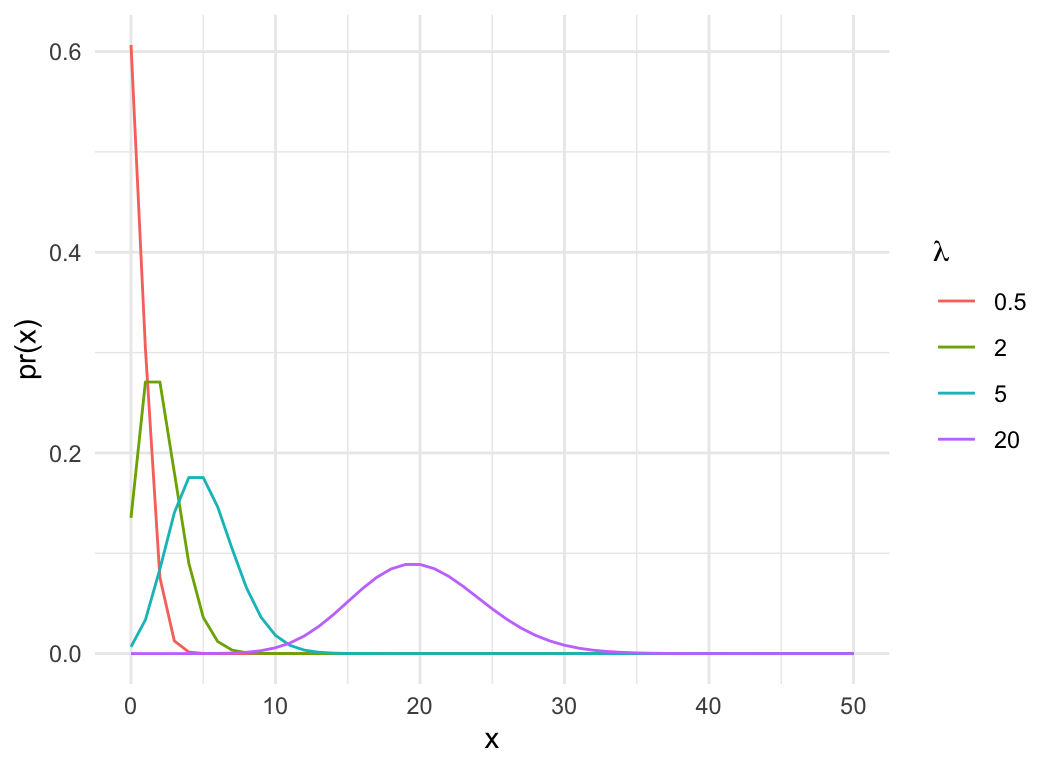 - mean = variance = \(\lambda\)