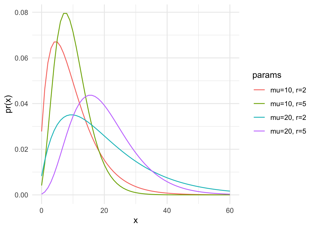 - In biology, often parameterized by mean (\(\mu\)) and dispersion (\(r\)) instead of size (\(r\)) and probability (\(p\)), used for “overdispersed” counts