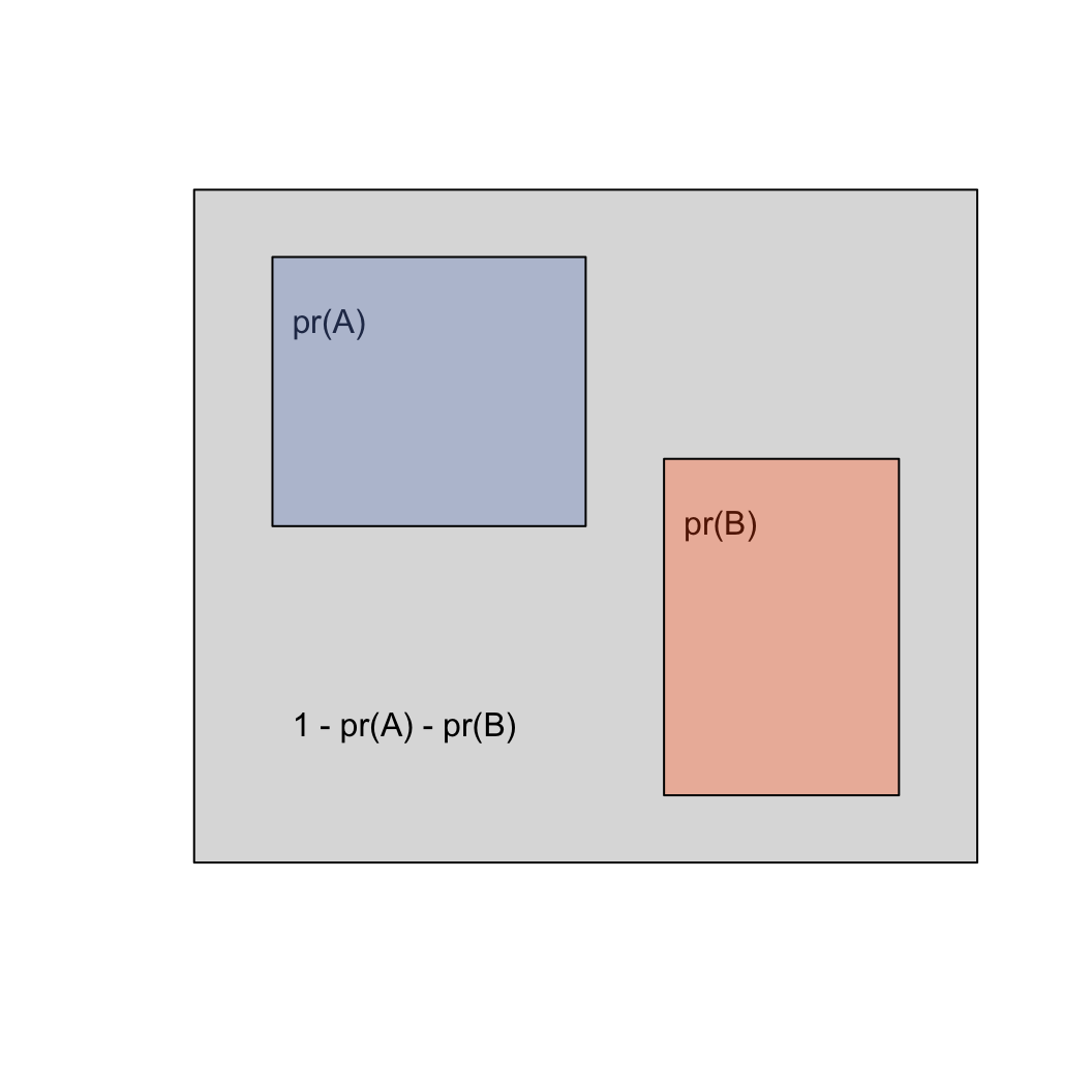 - for disjoint events, pr(A,B) = 0, so \(A \cup B = pr(A) + pr(B)\)