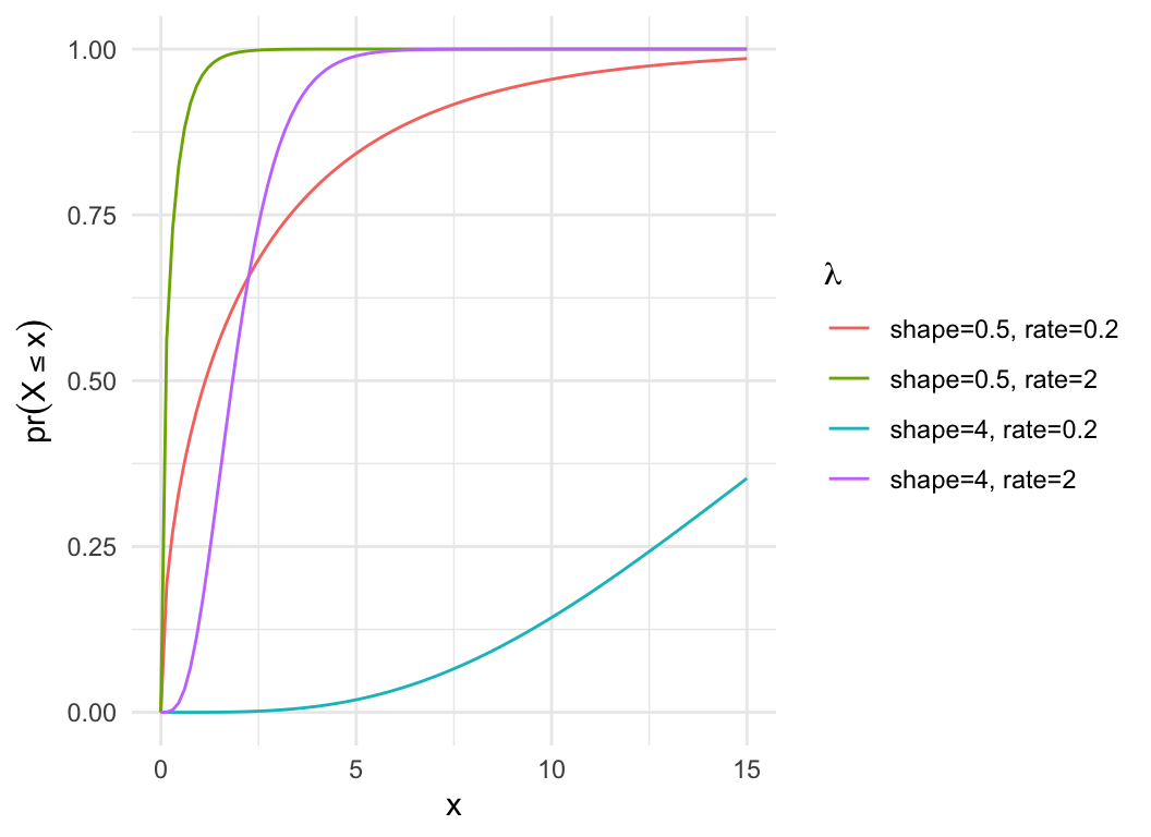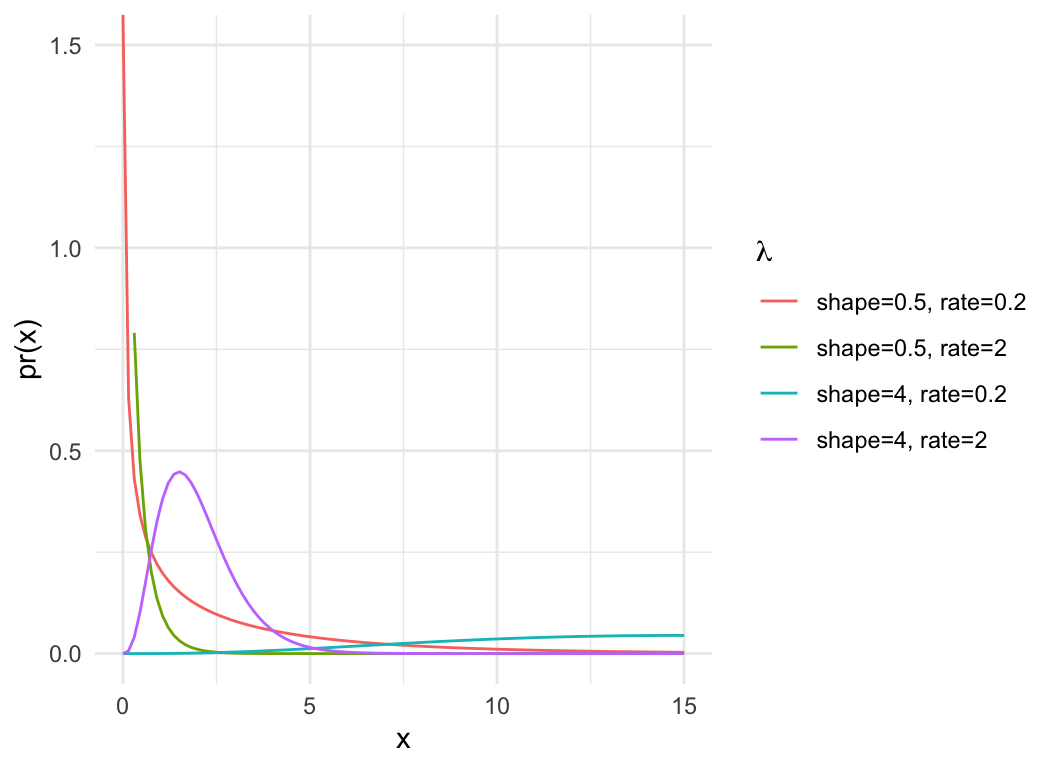 dat = expand.grid(x=seq(0,15, length.out=100), shape=c(0.5, 4), rate = c(0.2, 2))