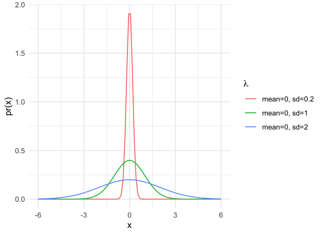 dat = expand.grid(x=seq(-6,6, length.out=100), mu=0, sd = c(0.2, 1, 2))