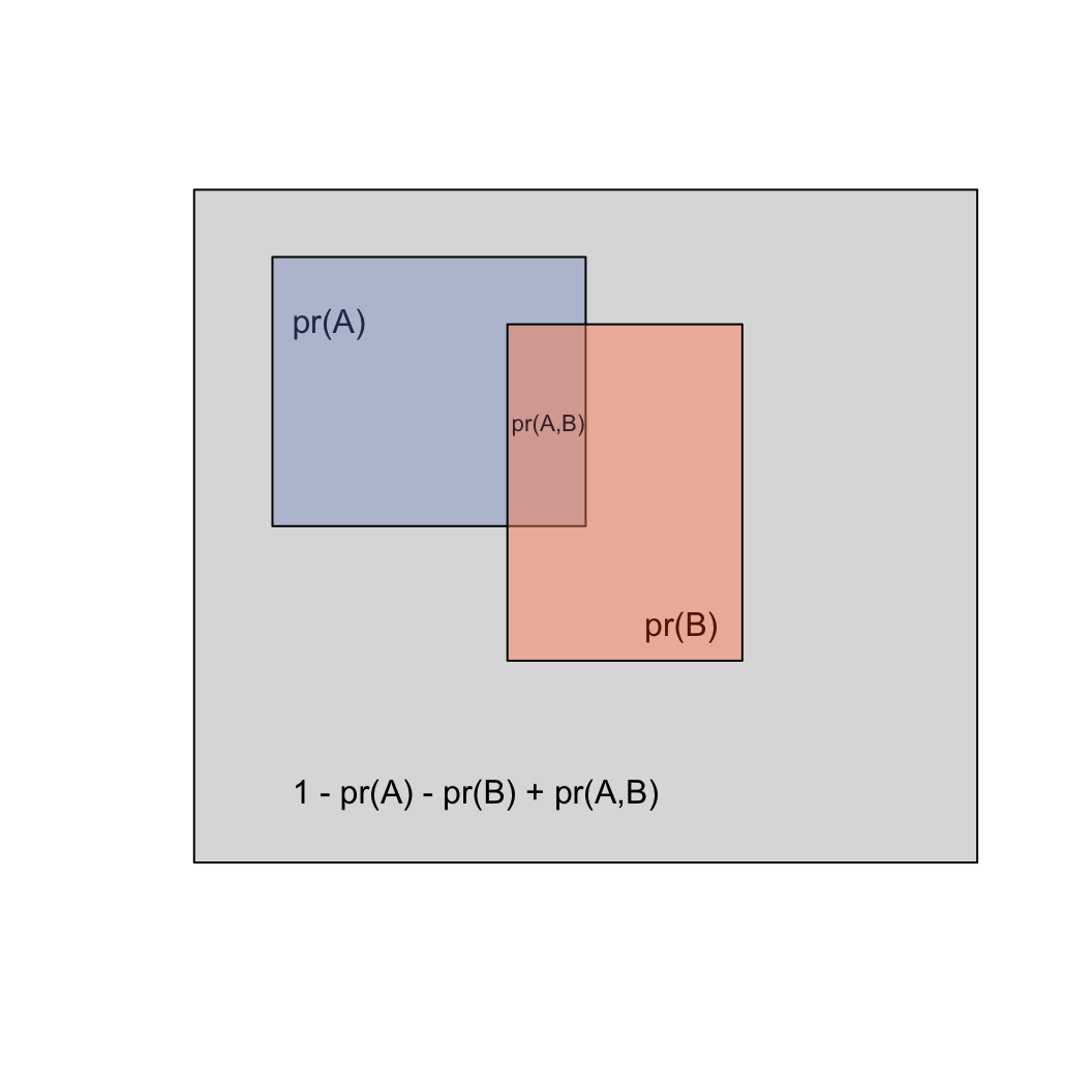 - pr(A) + pr(B) - pr(A,B) is the union (\(A \cup B\))